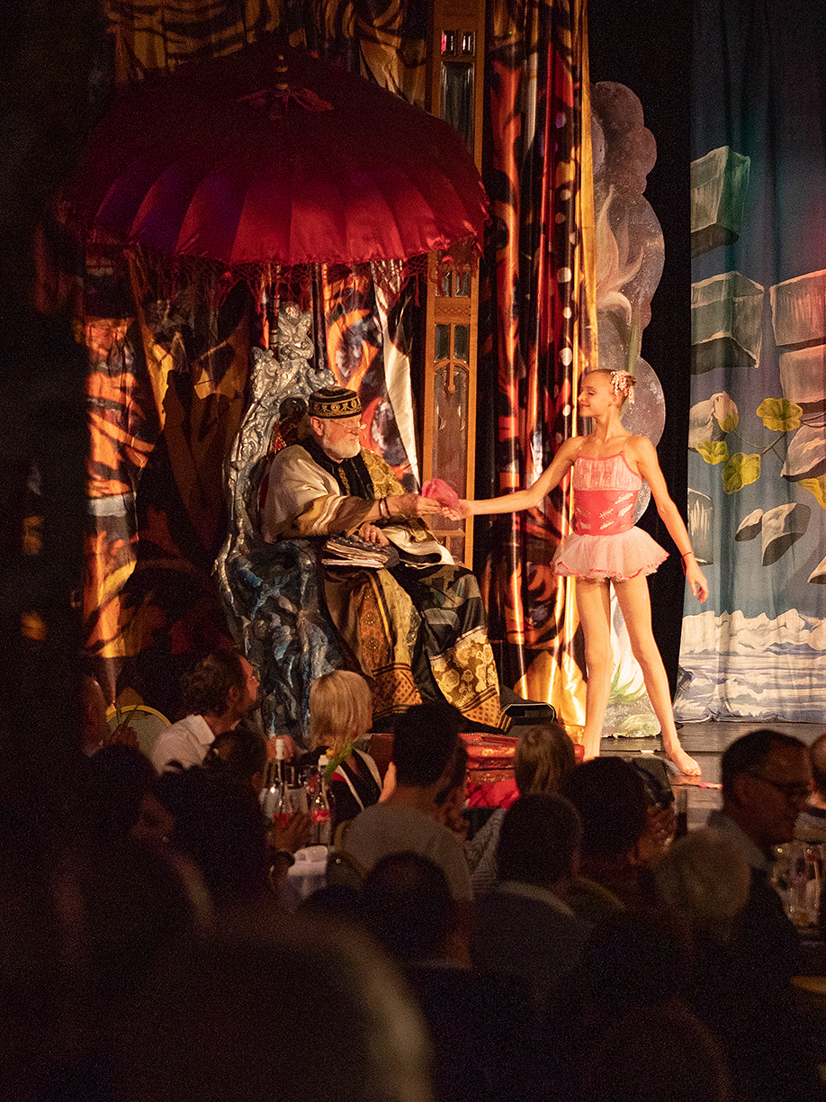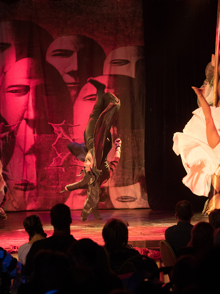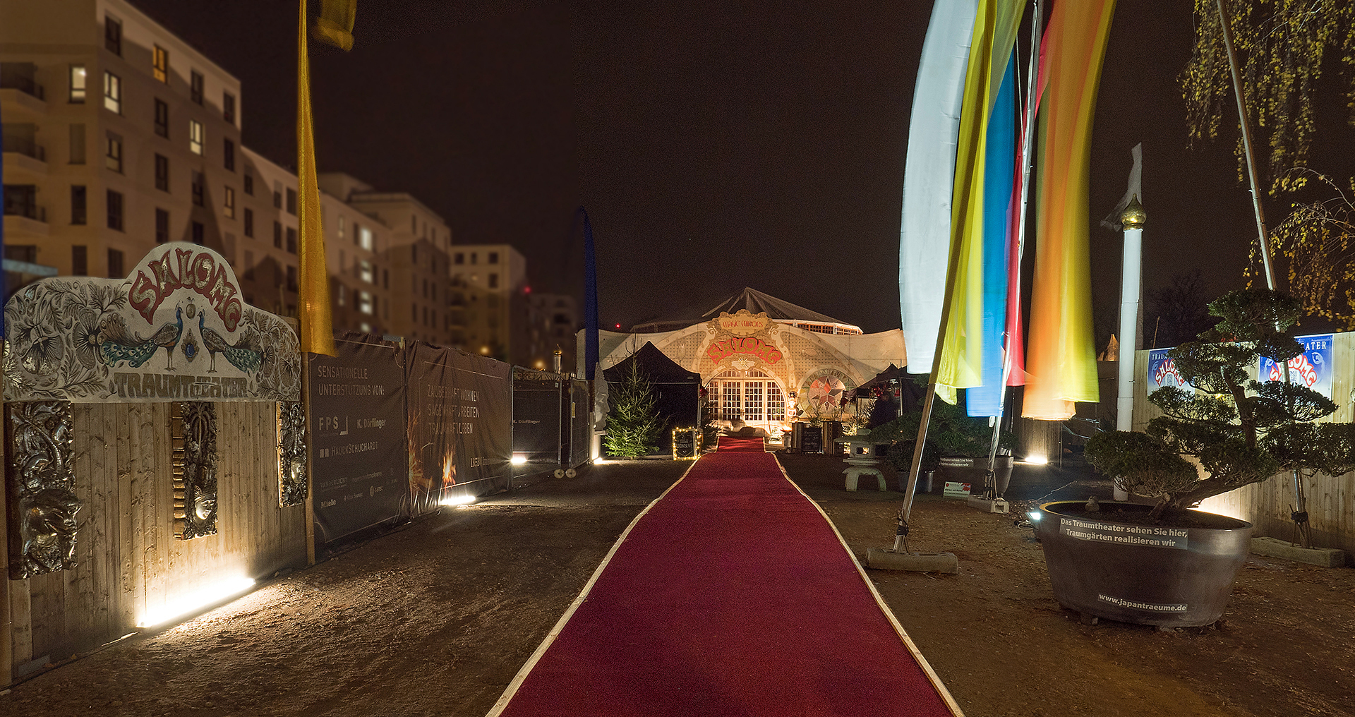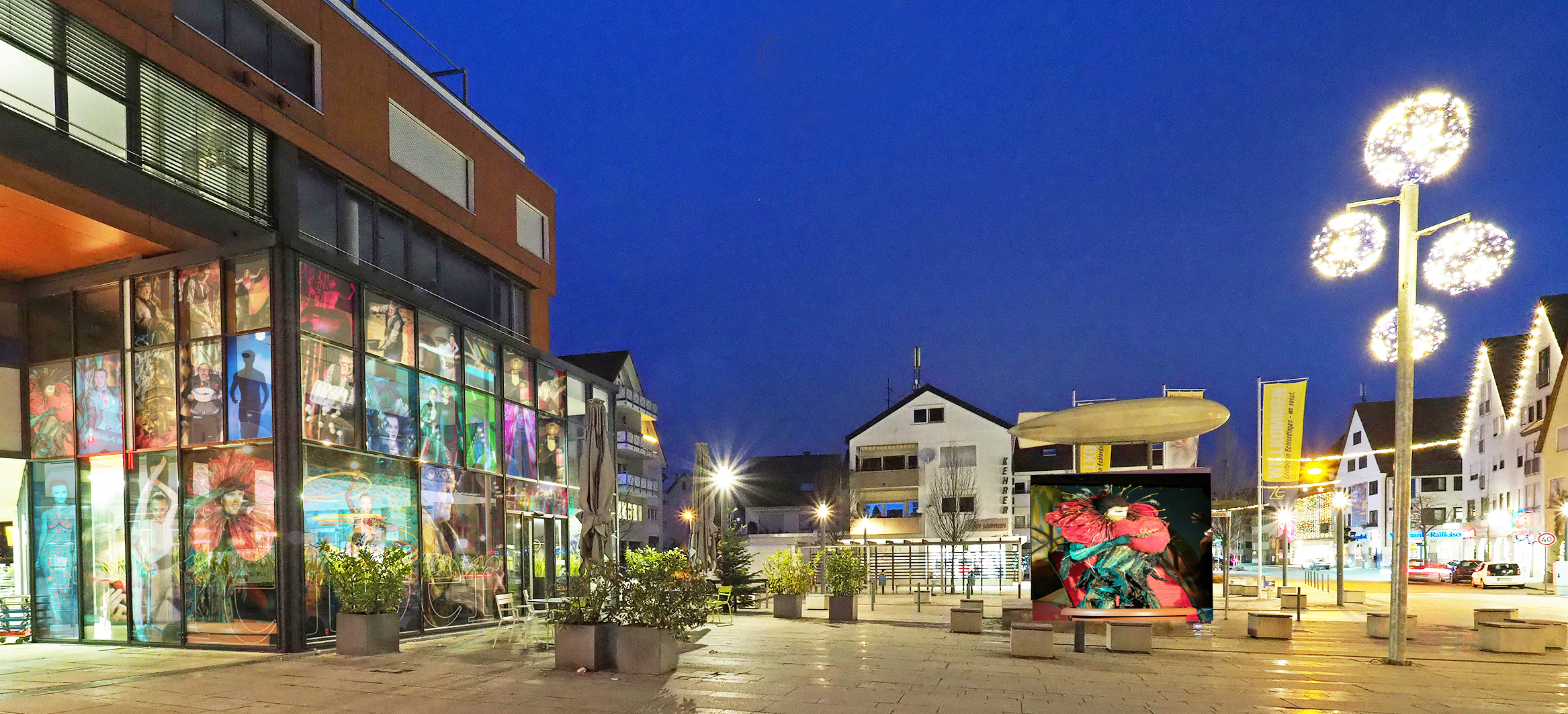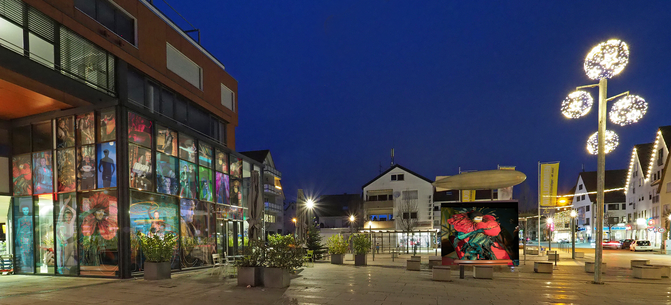 Die Fotos von Traumtheater wurden großformatig, transparent auf die Scheiben des Pavillions der Bäckerei Treiber aufgebracht.